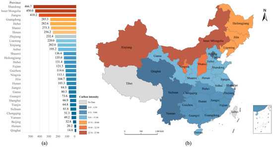 35] and exhibited significantly higher carbon intensities, often exceeding 25 tons per CNY 10,000—five times higher than those of southeastern coastal regions. By contrast, economically advanced areas such as Beijing and Shanghai had significantly lower carbon intensities, approximately 5 tons per CNY 10,000. Southwestern provinces benefit from abundant clean energy resources such as wind, hydroelectric, and solar power [
