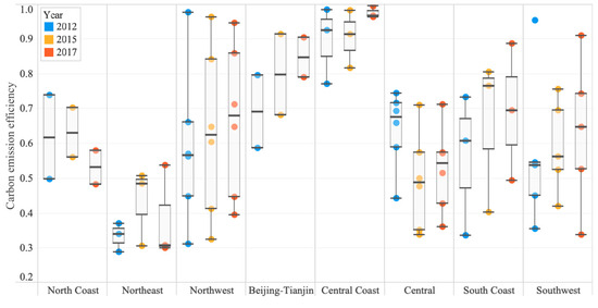 Figure 4, revealed significant regional disparities, closely aligned with economic development levels. Economically advanced regions, such as the Beijing–Tianjin–Hebei area and eastern coastal provinces, demonstrate superior efficiency levels. For example, the average efficiency in the Beijing–Tianjin–Hebei area increased from 0.69 in 2012 to 0.85 in 2017, while eastern coastal provinces consistently maintained efficiency levels above 0.8. Notably, the boxplot lengths for these regions shortened from 2012 to 2017, indicating that carbon emission efficiency has become more concentrated and stable over time.