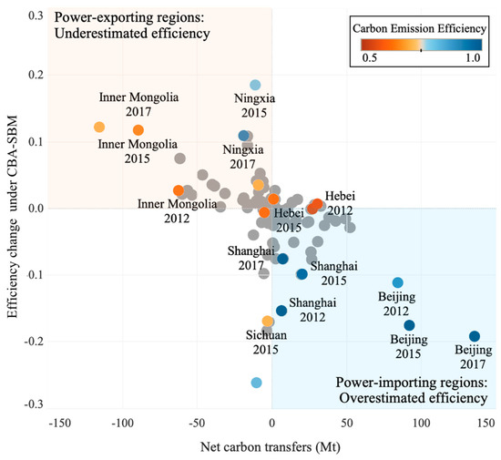 Figure 5. This analysis highlights how carbon transfers influence efficiency evaluations in both power-importing and power-exporting regions. Without incorporating the effects of inter-regional electricity transmission, the carbon emission efficiency of certain regions may not represent their actual circumstances.