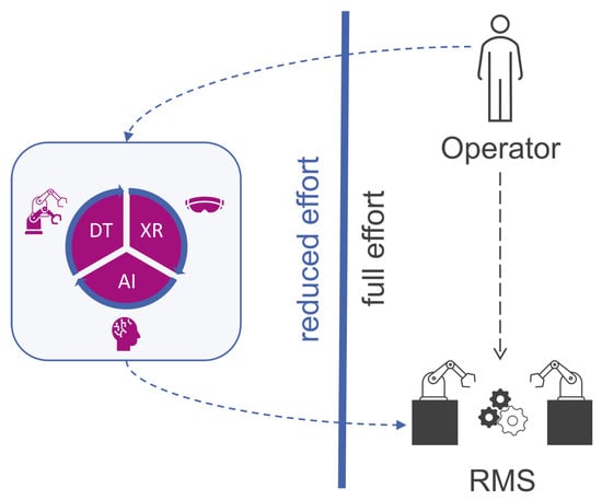 Another review focuses on reconfigurability enablers in human-centric RMSs, emphasizing the integration of DTs, AI, and XR to reduce the reconfiguration effort [35]. The review outlines three key components of the reconfiguration effort: reconfiguration cost, reconfiguration time, and ramp-up time—the time taken by the system to reach a normal production state after reconfiguration. In addition to physical enablers, such as adjustable layouts, logical enablers such as DTs, AI, and XR play a critical role in supporting operators during reconfiguration. DTs for both products and RMSs enable the design and analysis of configurations with minimal effort, significantly reducing the reconfiguration effort. Human–machine interfaces (HMIs) support the dynamic acquisition of context-relevant information, with VR helping to reduce ramp-up time by simulating configurations or tracking operators during reconfiguration execution, providing real-time support and guidance. The review also highlights the importance of standardized software and hardware components in enabling decentralized control architectures, which further reduce the reconfiguration effort. HMIs allow bidirectional feedback loops between the RMS and the operator, allowing operators to report problems and ML algorithms to automate problem detection and machine reprogramming. This combination of sensory devices and ML facilitates real-time decision-making and rapid responses during ramp-up. Additionally, HMIs such as AR provide guidance during task execution, while ML can integrate operator experience and context-related information to support reconfiguration. In this context, VR and digital feedback improve operator training, allowing them to quickly adapt to new tasks.