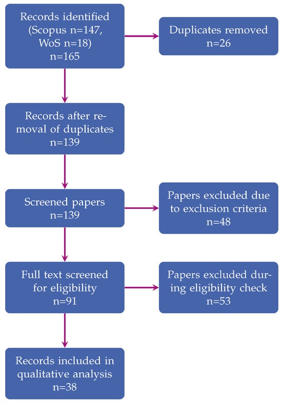 The titles and abstracts of the 139 unique articles were screened against predefined inclusion and exclusion criteria, as summarized in Table 5. This initial screening resulted in the selection of 91 articles for further eligibility assessment. During the eligibility phase, the full texts of these 91 articles were thoroughly examined to ensure that they provided meaningful information on the integration of AI, DTs, and XR in RMS. The focus was on identifying studies that offered theoretical and practical advances in this field. During this phase, 53 articles were excluded due to factors such as limited scope, lack of evaluation or validation, or insufficient relevance to reconfiguration processes within RMS. As a result, 38 articles satisfied all the criteria and were incorporated into the final qualitative and quantitative analysis.