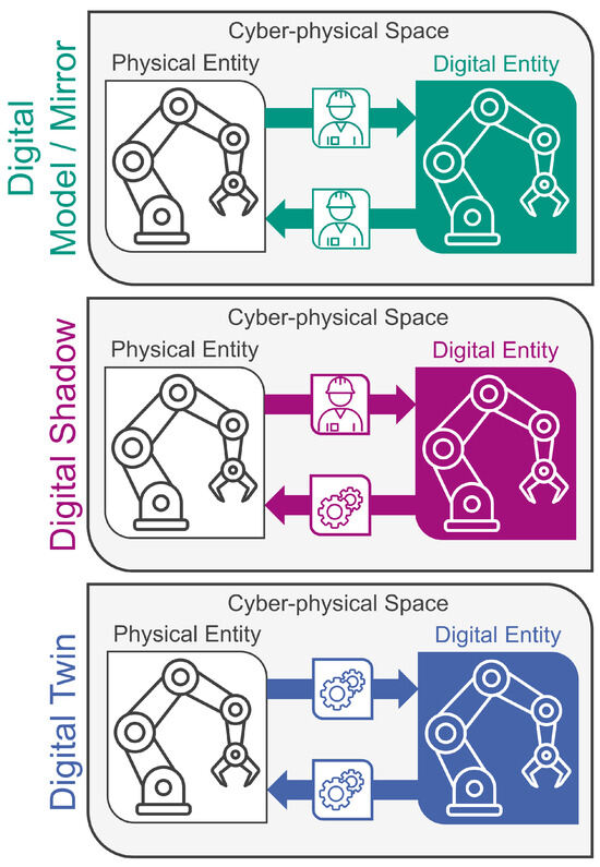 DTs have shown promise in reducing the reconfiguration time by up to 58%, increasing system availability, and enabling the manufacturing of customer-specific products [19]. ElMaraghy et al. [20] described the current evolutionary phase of manufacturing systems as being supported by Cognitive Digital Twins, which go beyond traditional DTs by enabling interconnected and adaptive systems with embedded sensors and software. Cognitive DTs represent a paradigm shift in human–machine interaction, facilitating interactions with increasingly intelligent and complex machines.
