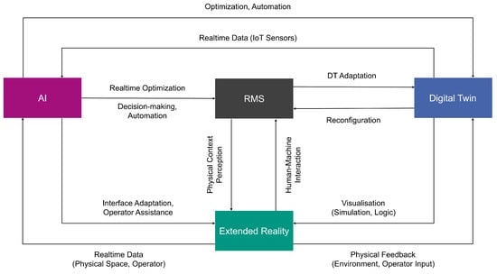 XR: Extended Reality (XR) encompasses immersive technologies such as Augmented Reality (AR), Virtual Reality (VR), and Mixed Reality (MR), which enable enhanced interaction between physical and digital spaces within RMSs. According to Milgram’s reality–virtuality continuum, XR technologies range from purely physical environments augmented with digital information (AR) to fully immersive digital environments (VR), with MR enabling a blend of both. In RMSs, XR supports real-time visualization, simulation, and control, providing intuitive interfaces that assist operators in complex reconfiguration tasks and enhance human–machine interaction [21].
