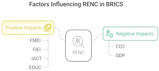 The objective of this study is to examine the link between the dependent variable RENC and a set of independent variables, including information and communication technology (IACT), financial institution efficiency index (FIEI), financial market efficiency index (FMEI), economic growth (GDP), carbon emissions (CO2), and education (EDUC). The transition to renewable energy consumption (RENC) in BRICS countries (Brazil, Russia, India, China, and South Africa) is influenced by factors like economic growth, technological innovation, financial systems, and education [100]. While GDP increases energy demand, potentially raising fossil fuel consumption and CO2 emissions, it also creates opportunities for investment in renewable energy [101]. As these nations industrialize, their economic growth drives the expansion of renewable energy solutions, although achieving this requires integrating technologies and financial systems capable of supporting the transition. Reducing CO2 emissions is critical, especially in countries like China and India, where industrialization has significantly increased energy consumption and emissions [102]. As a result, promoting cleaner technologies and investing in renewables can help reduce carbon footprints, supporting global climate goals.