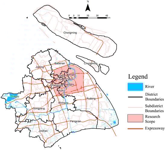 This study focuses on the central urban area of Shanghai, encompassing the A20 outer ring road and spanning approximately 660 square kilometers. It comprises seven districts within the A20 ring road: Huangpu, Xuhui, Changning, Yangpu, Hongkou, Putuo, and Jing’an (the new Jing’an district after merging with Zhabei), as well as the part within the A20 outer ring road of Pudong New Area and other adjacent administrative divisions (Figure 1). It is a concentrated built-up area with a dense population distribution. As of 2021, the population reached approximately 12 million, accounting for almost 50% of Shanghai’s overall population. The study area represents the most economically and socially active part of Shanghai, with a long and complex spatial evolution, continuous urban renewal, changing spatial and functional structures, and diverse residential area types.