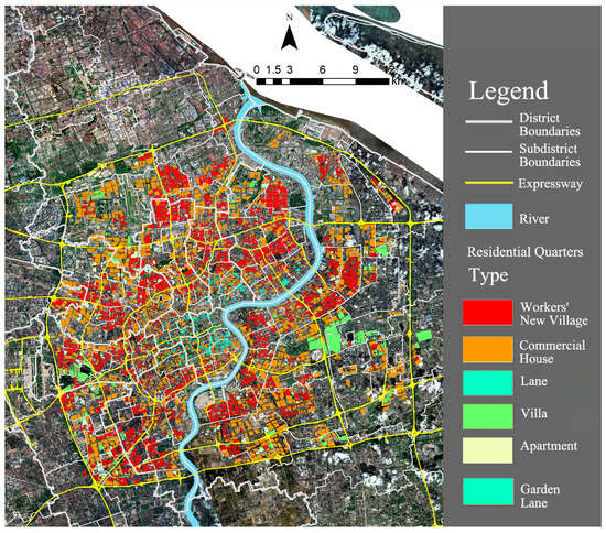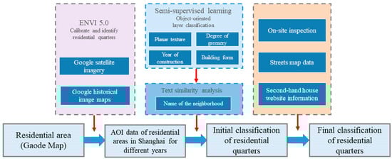 The residential quarter data from Gaode Map were used to obtain area of interest (AOI) data, including information such as latitude, longitude, boundary, and name, through a web crawling method (https://www.amap.com/, accessed on 11 December 2021). We imported the satellite image maps into ENVI 5.0 for residential area identification and calibrated the identification results against the Gaode Map AOI data to obtain the 2020 data. The AOI data were integrated with satellite image map information and calibrated using semi-supervised classification and manual visual translation methods [48]. The semi-supervised learning method is able to achieve high classification accuracy using a small number of labeled samples and a large number of unlabeled samples. The extraction of residential area data is achieved by combining low-pass filtering and averaging features from the gray-scale co-occurrence matrix (Figure 2). The residential quarters were classified into six types: commercial houses, workers’ new villages, garden lanes, lanes, apartments, and villas [49], resulting in 6731 residential quarters overall according to their architectural texture and period of construction (Figure 3, Table 1). In addition, major differences were identified in the size of residential quarters, which only reflects the characteristics of the residential agglomeration scale to a certain extent, and cannot form the judgment of the residential spatial structure.