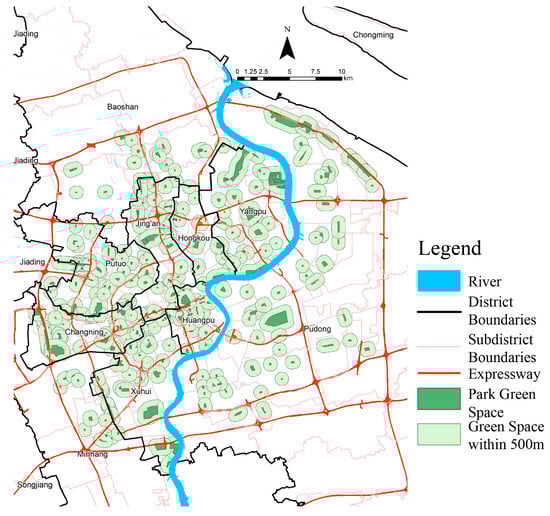 The basic data included administrative boundaries and satellite image maps of the study area; satellite image maps of Shanghai from 2020 were obtained using an online open-data platform (https://earth.google.com/web/, accessed on 10 June 2021). Administrative boundaries were also acquired by consulting the official websites of each district government and civil affairs department.
