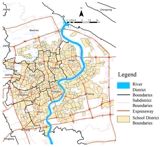 The spatial boundaries of all primary school districts within the study area in 2020 were obtained by entering their addresses into the corresponding areas of the Gaode Map (Figure 5). This was achieved using the 2020 Primary School District Boundary Notification published on the websites of the seven districts in the central city and the Pudong New Area District Government, combined with the school district boundary information published on the Internet (https://www.sohu.com/a/386317057_120621829, accessed on 19 December 2022).