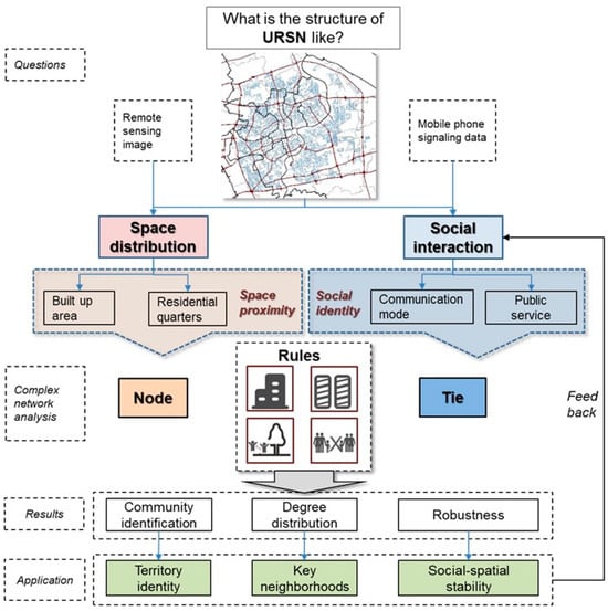 The URSN is a key urban functional network linking physical and socio-spatial networks, reflecting both the spatial fabric and socioeconomic processes of the city. These two factors interact and shape each other to some extent. The application of the complex network approach known as “community identification” for place identification in urban areas reflects spatial organization in terms of proximity, shared facilities, and school districts, as well as relatively consistent social backgrounds, lifestyles, characteristics, and social trust [68]. The modular definition of “community” is expressed as follows: