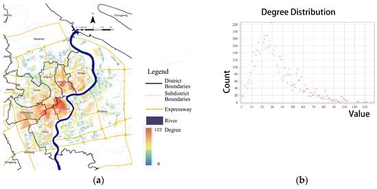 Distribution of URSN “degrees” in the study area in 2020: (a) geographical distribution of node “degrees” of residential quarters; (b) number distribution of node “degrees” of residential quarters.