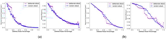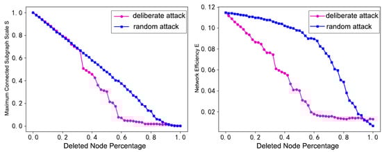 Firstly, network robustness, also referred to as network stability, measures the resilience of a network and reveals its ability to recover from disturbances and identify critical nodes [61,62].This reflects the network’s ability to maintain its overall functionality and determine alternative paths for network connectivity when it is disrupted or its structure changes. In the face of random attacks, networks with a power-law distribution of “node degrees”, small-world characteristics, and complex and multiple relationships tend to be more robust. In general, the network robustness can be tested by “attack” detection, “percolation” detection, and slime mold algorithm tests [63]. There are two types of attacks: random and deliberate. A random attack randomly removes “nodes” or “ties” from the network, while a deliberate attack eliminates “nodes” from the network in order of “degree” to measure network connectivity and stability, and obtain a threshold for network “collapse”; a higher threshold indicates a more robust network.