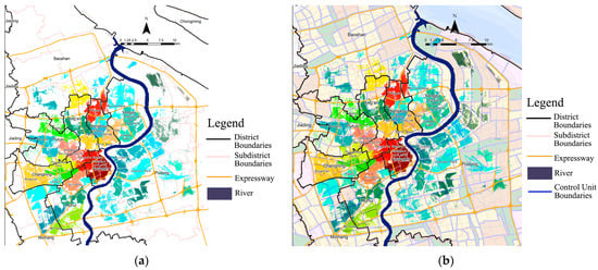 “Community” identification and distribution of URSNs in the study area in 2020: (a) “community” identification results; (b) overlay of “community” identification and control planning unit.