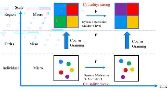 Aligned with the underlying explanatory mechanism of complex network analysis, this study conceptualizes residential quarters as “nodes” in a complex network and uses the social interactions of individual residents as the basis for establishing “ties” between residential quarters. A coarse-grain strategy was used to study groups of individuals of a specific size. This is only appropriate for a particular question at a specific spatial and temporal scale and does not allow for the emergence of patterns across scales (Figure 12) (https://swarma.org/?p=34352, accessed on 26 June 2024). Therefore, an appropriate spatial “coarse-graining” scheme should be developed according to the characteristics of the urban problem under study, considering the correlation and consistency between individual behavior and macroscopic phenomena. For example, cell phone signaling data can be used to solve the coarse-graining problem. Location information obtained through cell phone signaling can be used to identify more specific homogeneous residential groups in a larger gated residential area and to resolve the daily interactions between residential groups. At the same time, based on residents’ daily movement trajectories, the social connections between different residential spaces due to residents’ visits can be more accurately revealed.
