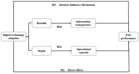 The depth of digital technology application can be defined as the extent to which digital technology is integrated with physical industry sectors. The depth of digital technology adoption fosters a high degree of agility toward forward-looking technologies [] and improves operational models and product services []. The advent of new digital operating models has the potential to optimize production processes [] while simultaneously facilitating the dismantling of technological barriers to production, thereby enhancing the efficiency of firms’ production operations []. Kame Babilla (2023) and Liu (2023) have demonstrated that digital technologies can optimize the efficiency of internal operations, which can, in turn, lead to additional financial profits [,]. Furthermore, from a perspective of resource utilization, digital technologies facilitate the rationalization of resource allocation, thereby increasing the rate of resource reuse. From an environmental standpoint, digital business processes can serve to mitigate detrimental impacts on the environment, including reductions in greenhouse gas emissions and inefficient energy use []. From a societal perspective, Richardson’s findings indicate that advances in digital technology have prompted companies to increase their investment in complex technologies that are further integrated with physical operations. This has contributed to the advancement of innovative products and smart production processes, as well as other related technological innovations. From a governance perspective, digital technology applications can enhance governance performance by reducing the cost of internal control or agency costs of firms [,]. In conclusion, the depth of digital technology adoption has a considerable impact on the improvement of a company’s ESG performance, mainly through the improvement of its operational efficiency. Based on the aforementioned evidence, the following hypotheses are developed: