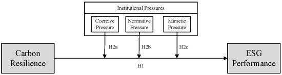 Governments, the media, benchmark companies, and other entities have put significant emphasis on navigating the low-carbon revolution of manufacturing enterprises. Carbon resilience, which reflects an organization’s ability to remain stable, adapt, and evolve amid low-carbon transformation, is vital for influencing enterprises’ low-carbon behavior and driving the sustainable growth of manufacturing enterprises. The existing literature has extensively explored the relationship between low-carbon behavior and ESG performance. For instance, it has been discovered that enterprises’ carbon strategies can drive higher carbon performances [18]. Additionally, it has been shown that enterprises’ green innovation can enhance ESG performances [43]. However, it remains unclear how carbon resilience can influence ESG performance in the context of low-carbon transformation. Additionally, corporate operations are closely linked to institutional pressures from governments, the media, and benchmark enterprises. Especially against the background of low-carbon transformation, enterprises’ activities are restricted by more and more strict policies, voices from the media, and low-carbon technology innovation pressure from benchmark enterprises. These pressures motivate firms to become legitimate subjects by impacting the rationalization of their structure, form, and behavior [30]. In the broader context of climate change, institutional and stakeholder pressures have been shown to enhance organizational capabilities and corporate competitiveness [70]. Therefore, drawing on dynamic capability theory, this study examines the relationship between carbon resilience and ESG performance and the boundary effect of institutional pressures (coercive pressure, normative pressure, and mimetic pressure) between them. Figure 1 shows the theoretical model.