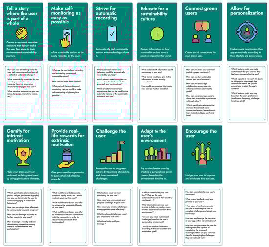 Similarly, Tancredi et al. [17] examined psychological theories on habit formation and Digital Behavior Change Intervention (DBCI) approaches—such as digital nudging, persuasive technology, and gamification—to develop design guidelines specifically aimed at creating mobile apps for sustainability, known as the Sustainable Behavior Application for Mobile devices (SBAM) guidelines. The SBAM guidelines, derived from behavioral theories and validated through focus groups with green users, consist of 11 design principles intended to guide designers in developing apps that promote sustainable behaviors based on theoretical foundations. Indeed, designing such apps is challenging due to the multitude of theoretical approaches available to maximize their effectiveness. Moreover, relying solely on design guidelines presented in a tabular format can limit creativity and become overwhelming during the design process. To make theoretical insights more accessible during the design phase, one practical solution is the use of design cards [25,26,27].