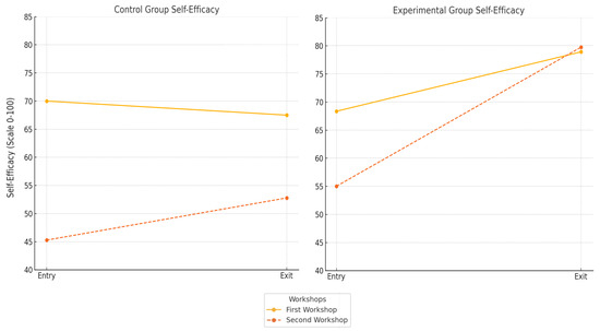 Comparison of self-efficacy scores (Entry and Exit) for the control group (on the left) and for the experimental group (on the right) in the first and second workshops. The experimental group in both workshops shows significant increases in Exit scores compared to Entry scores.
