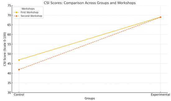 Comparison of CSI scores between experimental and control groups across the first and second workshops. The experimental group consistently outperformed the control group, with significant differences observed in both workshops.