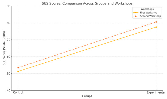 Comparison of SUS scores between experimental and control groups across the first and second workshops. The experimental group consistently scored higher than the control group, with significant differences in both workshops.