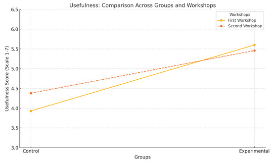 To further investigate H3b: SUS of [E] group > SUS of [C] group, the SUS scores of both groups were compared. The experimental group, which interacted with the deck of cards, achieved a significantly higher score (77.5, SD = 20.92) compared to the control group, which received theoretical pages (51.25, SD = 6.69). An independent-samples t-test confirmed this difference as statistically significant (t(9) = 3.60, p = 0.005), with a large effect size (Cohen’s d = 1.40, 95% CI [0.42, 2.38]), confirming H3b (Figure 5, represented by the yellow solid line).