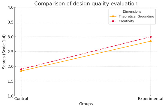 Comparison of scores for the Theoretical grounding and Creativity dimensions between experimental and control groups, as rated by the design quality evaluators. Both differences are statistically significant.