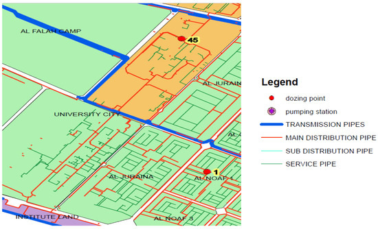 A hydraulic model of the current WDN of the study area was utilized to theoretically implement failure scenarios and examine the system’s performance. WaterCAD software 10.3 was used to model failure scenarios. Subsequently, the categories of failure scenarios or stress (pipe failure, excess demand, and initial chlorine concentration) were selected based on the literature, and recognizing the network’s responses [28]. Once the models were run, the corresponding WDN responses were recorded based on failure on the nodes, pressure, and chlorine residual. The failure of the WDN to provide a minimal standard of services was defined in the literature. For this study, the minimum acceptable pressure and residual chlorine concentration were 20 psi (137,895 Pascal) for water quality and 0.5 mg/L for pipe failure. Node failure was defined as having no water supply in any node.