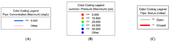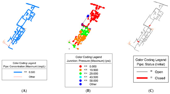 - For RI 80%: the lowest score was for water contamination with 4; hence, it is recommended to ensure that the chlorine concentration in the pipes colored in blue, as shown in Figure 6A, meets the water quality regulations in the UAE, and it is between 0.5 mg/L and 5 mg/L. Additionally, for the water excess demand with a 4 score, it is recommended to ensure that the junctions with the color red and orange, as shown in Figure 6B, are maintaining the acceptable water pressure, which is between 20 psi and 60 psi. Lastly, for the pipe failure, it is recommended to ensure that two pipes, which are colored in red as shown in Figure 6C, do not fail, and if, in case of failing, a prompt recovery response is needed to reduce the number of impacted nodes;