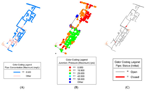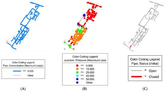 Figure 4. Management plan for RI 40%: (A) contamination; (B) pressure level; and (C) pipe failure.