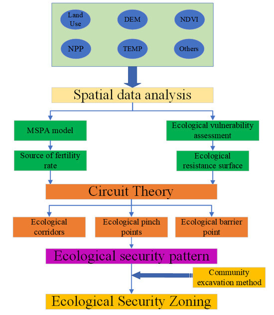 Ecological security refers to the state in which the ecological environment required for the survival and development of a country, region, or human society is not threatened or is less threatened by destruction. It is an important guarantee and condition for the sustainable and stable development of a complex ecological security system and a city [1]. The concept of ecological security aims to ensure the safety, health, and sustainable development of resources, environment, and ecosystem services, strengthen beneficial ecological processes, control harmful ecological processes, and seek ways to ensure ecological security [2]. Constructing a regional ecological security pattern can achieve effective regulation of ecological processes, thereby ensuring the full play of ecosystem functions and services, ensuring the sustainable supply of regional ecosystem services, and ultimately achieving ecological security [3]. The research on the construction of ecological security patterns originated from the research on land health issues in the 1940s [4]. Large-scale industrial construction has greatly damaged biological habitats and ecological environments. In order to prevent human activities from further affecting biodiversity and ecological security, researchers began to focus on related aspects such as biodiversity conservation and ecological restoration [5]. Later, with the rapid development of regional economy and rapid urbanization, the research on the construction of regional security patterns has become more comprehensive, focusing on reducing regional ecological risks and enhancing the stability of regional ecological structure [6]. For example, Liu J et al. used the multi-index evaluation method, the minimum cumulative resistance (MCR) model, and the circuit connectivity model to construct an ecological security pattern for the ecological security issues in the Songnen Plain [7]. Gong D et al. identified ecological sources through the “ecosystem service function-ecological sensitivity-landscape connectivity” evaluation system, extracted ecological corridors and nodes using methods such as the minimum cumulative resistance and gravity model, and constructed the ecological security pattern of Nanchang City, emphasizing the organic unity of urban expansion and ecological protection [8]. Wenqi Q et al. constructed a new framework of the ecological security pattern ESP for the coastal city of Qingdao: surface (ecological source)–line (ecological network)–point (pinch point, obstacle point) to balance the development of coastal urban areas and the protection of the ecological environment [9]. Qiong Q et al. constructed the ecological security pattern (ESP) of Taiyuan City, located in the eastern part of the Loess Plateau, to analyze the severe ecological problems caused by urban expansion and enhance urban resilience [10]. Xiaoying L et al. constructed an ecological security pattern for important biodiversity protection areas in the Yangtze River Delta, protected severely damaged natural habitats, and provided scientific guidance on ecosystem changes and corridor construction [11].