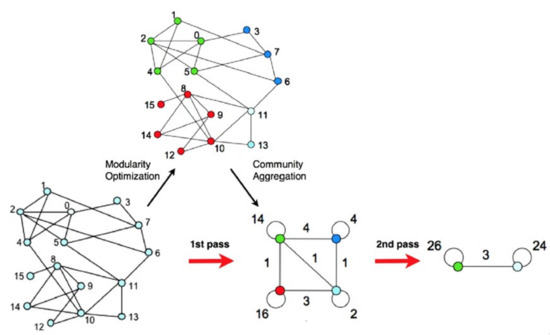 This paper uses the Louvain algorithm [30] in community mining to explore the set of ecological sources in the ecological network that are closely connected internally and sparsely connected externally. The basic idea is that the nodes in the network try to traverse the community labels of all neighbors and select the community label that maximizes the modularity increment. After maximizing the modularity, each community is regarded as a new node, and the process is repeated until the modularity no longer increases. The algorithm process is implemented by the community module of the python-Louvain library in Python 3.8.10 software. As shown in Figure 3, Louvain’s algorithm divides network nodes into internally connected communities by iteratively optimizing the modularity (Modularity). In this study, it was applied to the ecological source area network to identify five ecological functional areas.