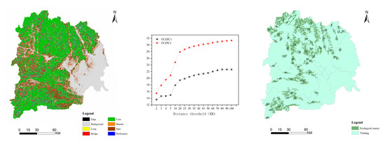 The strength of landscape connectivity is an important determinant for judging whether species in the region can successfully exchange information and migrate [19]. By evaluating the degree of connection and connectivity between various landscape elements in the region, the integrity of the landscape pattern, the protection of biodiversity, and the health of the ecosystem are assessed, which is an important indicator for judging the quality of ecological sources. This paper uses the representative overall connectivity index (IIC) and possible connectivity index (PC) to analyze the landscape connectivity of the ecological source in Yichang City based on Conefor2.6 software (a tool for landscape connectivity analysis).