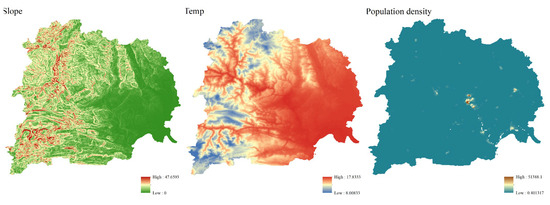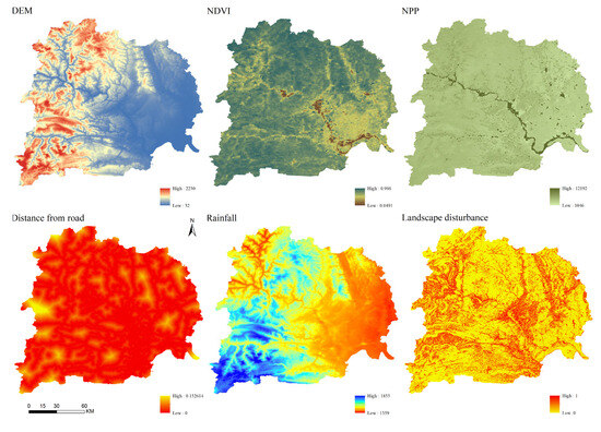 Ecological sensitivity refers to the degree to which an ecosystem responds to changes in the natural environment and human interference and the difficulty and possibility of regional ecological and environmental problems. It is usually related to the natural attributes of the regional ecosystem. This paper selects four basic ecological attributes, namely elevation, slope, average annual rainfall, and average annual temperature, from topographic factors and climatic factors to judge the ecological basis of the study area and selects the landscape disturbance factor to reflect the degree to which the regional ecological landscape is disturbed by the outside world. The greater the ecological landscape pattern is affected by human and natural interference, the stronger the ecological sensitivity. The calculation process is as follows below.