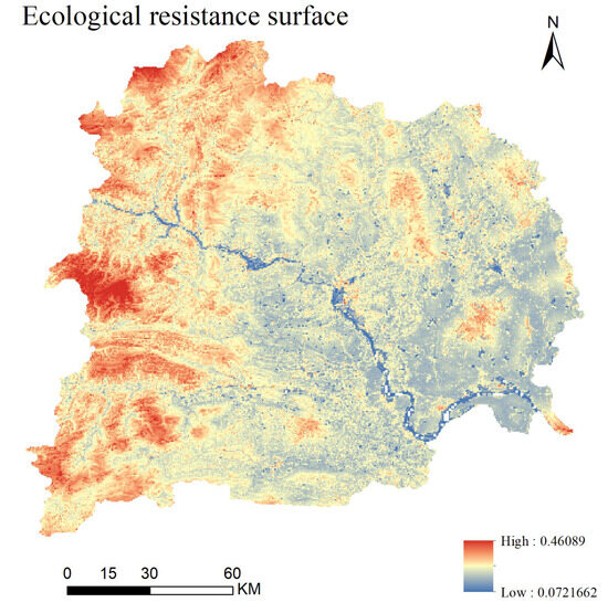 Figure 5 shows the spatial distribution of nine resistance factors, including elevation, slope, and population density. High-resistance areas are concentrated in the western high-altitude regions, primarily due to steep slopes and low vegetation cover. In contrast, low-resistance areas are found in the eastern plains, where flat terrain and high connectivity facilitate species movement. As shown in Figure 6, the comprehensive resistance surface value of the study area is between 0.101 and 0.528, and the overall resistance value is at a medium–low level; from a spatial point of view, the high-resistance area group is distributed in the high-altitude areas in the west, which are mainly affected by altitude, slope, temperature, and landscape disturbance factors. The low-resistance area is mainly distributed in the eastern plain area with flat terrain and high landscape connectivity.
