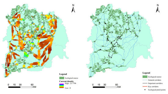 In circuit theory, gridded landscape data are converted into a resistor network model. Each grid cell is used as a node in the ecological network, and a resistor value is assigned according to the difficulty of species crossing the cell. The Circuitscape software is used to simulate the flow of current in the ecological network to calculate the current distribution in the landscape. These high current density areas are ecological pinch points [32], which are key channels for biological migration.