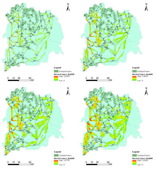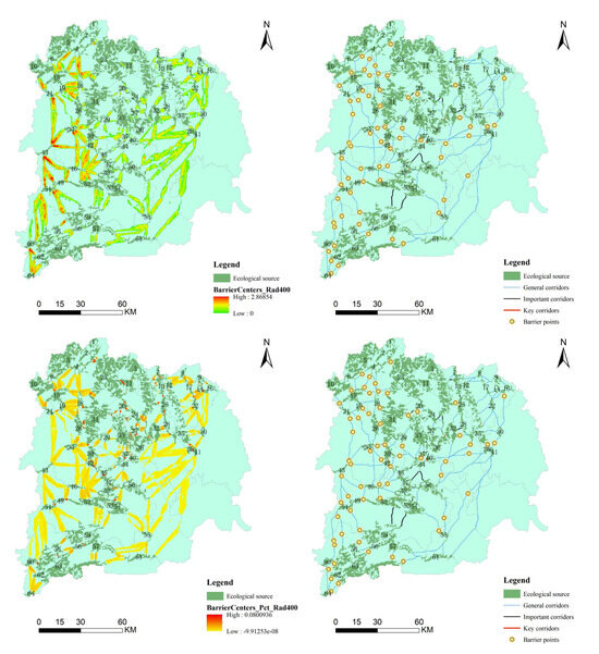 In the Barrier Mapper module, the moving window method is used to search for obstacles with a radius of 200–800 m and a step length of 200 m according to the pixel resolution. The results are shown in Figure 9. As can be seen from the figure, high obstacle areas are mainly distributed in the general corridors in the west. These areas have large slopes and terrain fluctuations, and the resistance to biological migration is large. After expanding the search radius, it can be seen that the distribution of high obstacle areas has not changed significantly, only the width of the obstacle area has increased. The excessively large range of obstacle areas will greatly increase the cost of subsequent ecological restoration. Considering it comprehensively, this paper selects 400 m as the obstacle area search radius. At the same time, in the Barrier Mapper module, the percentage option between the improvement score and the least cost path LCD (least-cost distance) is selected, the value of the center pixel of the search window with the minimum cost distance value between the source areas is replaced, and 400 m is used as the obstacle area search radius. The unit minimum cost distance improvement value is used to represent the improvement of connectivity after the obstacle point is removed. The area with a large value is the obstacle point in the corridor. The comparison of the ecological obstacle point extraction results of the two is shown in the figure below.
