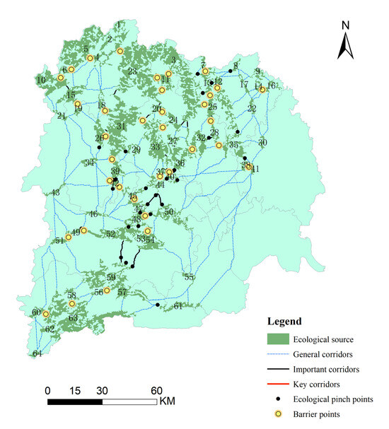 In circuit theory, ecological barrier points refer to areas with high “resistance” values in simulated biological flows, that is, areas that significantly hinder the flow of current on the migration path. In reality, they are areas in the landscape that significantly hinder species migration activities [33]. Identified ecological barrier points can be used to address bottlenecks on species migration paths and guide related ecological restoration and construction.