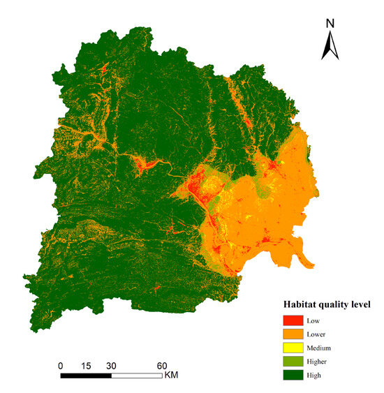 InVEST3.12.1 software was used to obtain the habitat quality distribution map of the study area. Then, the habitat quality of the study area was divided into five levels by the natural breakpoint method through the Arcgis 10.8 software, as shown in Figure 12. The mean value of the habitat quality in the study area is 0.79, and the overall habitat quality is at a high level. Among them, the high-level habitat quality area accounts for the largest proportion, with a total of 14,700 square kilometers, accounting for 69.2% of the total area of the study area. It is mainly distributed in the mountainous areas in the north, west, and southwest. These areas have a low degree of development, a large proportion of forest land, and are generally less affected by human activities. They basically cover the entire ecological source area. The low-level habitat quality area has a total of 0.04 square kilometers, accounting for 1.8%, which is basically located in the construction land area. Most of the low-level and lower habitat quality areas are distributed in the southeastern plain area. This area is a densely populated area, carrying most of the human living space, the ecological space is severely squeezed, and the ecological environment quality is low.