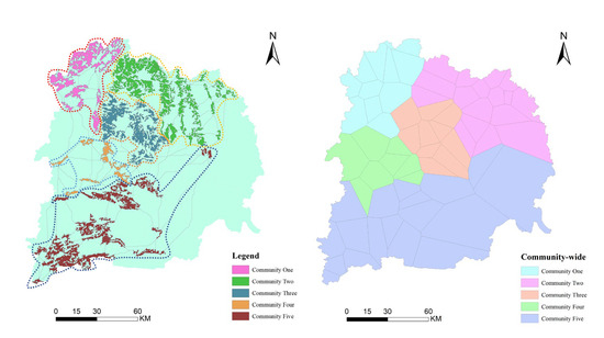The results of community mining in complex networks can only reflect the network characteristics in the topological structure. In the ecological network, each ecological source has an area and a certain range of influence. This paper links the community mining results to the ecological source based on ArcGIS 10.8 software and simulates the functional scope of each ecological source through the Thiessen polygon principle to more intuitively show the distribution of each community in the study area. Finally, the level of each community is determined based on the habitat quality of each community and the total area of the ecological source included. The results are shown in Table 5 and Figure 13.