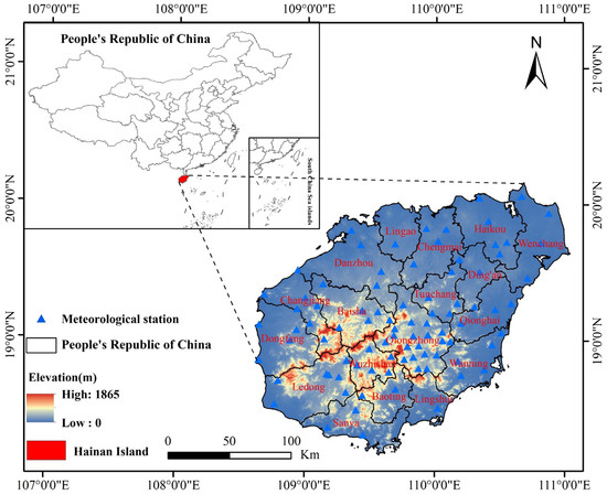 Hainan Island is positioned in the northern section of the South China Sea, between 108°37′ and 111°03′ E and 18°10′ and 20°04′ N, covering a total area of 33,900 km2. It lies to the south of Guangdong Province and the Qiongzhou Strait. Hainan serves as an important region for studying hot zone climate and habitat changes [38]. Hainan Island has the most tropical maritime climate in China, exhibiting an average annual temperature ranging from 22.5 to 26.0 °C and average annual precipitation between 923 mm and 2460 mm. The distribution of precipitation is irregular both spatially and temporally, with summer and winter being influenced by different monsoons, leading to distinct wet and dry seasons [30]. On average, Hainan Island experiences approximately three tropical storms and typhoons annually. The terrain of Hainan Island is unique. It is surrounded by low and flat areas, and the center is dominated by towering dome mountains, with WuZhi Mountain and Yingge Ling as the uplift center; the terrain gradually decreases around the island in the form of mountains, hills, platforms, plains, and beaches. Soil erosion in Hainan Island is mainly hydraulic erosion. Due to the high rainfall, high intensity, and large cutting depth of erosion gullies, the gully walls that form the gullies expand rapidly in both sides, resulting in a large amount of erosion [39]. Especially in the near past, due to the influence of global weather patterns, frequent short-duration heavy rainfall, and human activities, soil and water loss in the region area has become increasingly severe (Figure 1).