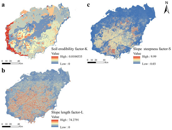 Spatial arrangement of static factors in Hainan Island. (a) Soil erodibility factor; (b) Slope length factor; (c) Slope steepness factor.
