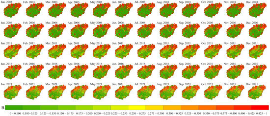 The dynamic evaluation of the B factor provides critical information for identifying hotspots of soil erosion, as this process is exacerbated in areas with bare or poorly covered soils. A lower value of factor B corresponds to a greater vegetation cover area and a decreased likelihood of soil erosion. Conversely, a higher B-factor value indicates increased sensitivity of bare or uncovered areas to soil erosion. In general, the B-factor exhibited a higher distribution trend in the northeast and a lower distribution trend in the southwest (Figure 5). The monthly mean values of B factor from 2003 to 2021 in the study area were 0.3139, 0.3158, 0.3252, 0.3255 and 0.2812, respectively.