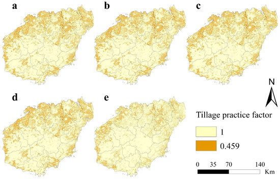 Tillage practices are designed to fertilize fields, increase agricultural output, and conserve both water and soil. They achieve this by altering micro-topography and increasing land cover through various tillage techniques [16]. The tillage factor (T) denotes the ratio of soil loss resulting from a specific tillage practice compared to soil loss in the absence of tillage under identical conditions. Hainan Island is part of the late triple cropping and hot triple cropping zones of the South China hilly coastal plain; the water and heat conditions in this area are the best in China, suitable for planting late double-cropping rice. Warm crops, tropical and subtropical cash crops, and fruit trees can also be grown in winter. The factor values for tillage measures were determined using the rotation measure assignment table from the Technical Guide for Dynamic Detection of Soil and Water Loss in 2020. In the land use grid map, the field assignment resulted in a T value of 0.459, whereas a value of 1 was assigned to other areas.