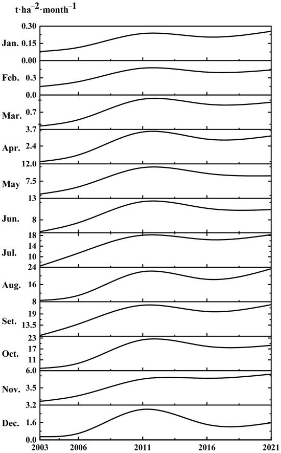 Based on the monthly soil erosion modulus from five periods (2003, 2006, 2011, 2016, and 2021), the monthly mean soil erosion modulus over five years was calculated as follows: