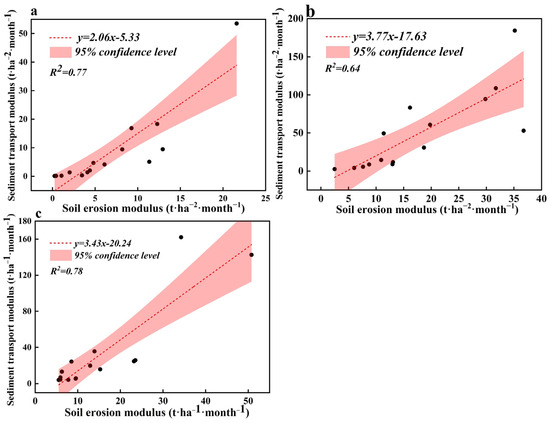 The soil erosion modulus is a comprehensive measure guided by various factors that contribute to erosion, including rainfall, terrain, and soil quality. Monthly soil erosion modulus values at a 10 m resolution for Hainan Island were calculated for the years 2003, 2006, 2011, 2016, and 2021 (Figure 7). The year 2011 is considered the most severe for soil erosion, with an annual average soil erosion modulus of 121.72 t·hm−2·a−1 and a soil erosion area of 2190.69 km2. The findings of this study align closely with the results of the first water conservancy survey conducted in China in 2011, which reported an area of 2116.04 km2 in Hainan Island. Additionally, a comparative analysis of the monthly sediment transport modulus measured at hydrological monitoring stations in three watersheds on Hainan Island over nearly 20 years (Figure 8) reveals the following results: The R2 value between the monthly soil erosion modulus in the Nandu River basin and the Nandu River Longtang station is 0.77 (Figure 8a). In the Changhua River basin, the R2 between the monthly soil erosion modulus and the Changhua River Baoqiao station is 0.64 (Figure 8b). In the Wanquan River basin, the R2 between the monthly soil erosion modulus and the Wanquan River Jiaji station is 0.78 (Figure 8c). Therefore, the calculated results demonstrate good reliability.