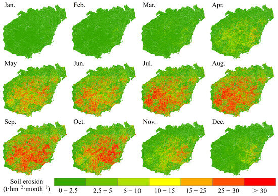 In this research, MODIS data, DEM data, daily rainfall data, and land use data were utilized to modify the Chinese Soil Loss Equation, which was used to estimate the monthly mean soil erosion modulus for Hainan Island during the past two decades. The main objectives are (1) to determine the annual distribution pattern of soil erosion based on static and dynamic factors; (2) to calculate the relative importance of erosion factors and quantify dynamic factors driving the dynamic changes in soil erosion; (3) and to obtain spatio-temporal control strategies for soil erosion throughout the year. To provide evidence and ideas for researching soil erosion in areas with similar characteristics, we analyzed the soil erosion status on a monthly timescale, using the tropical region as the entry point.