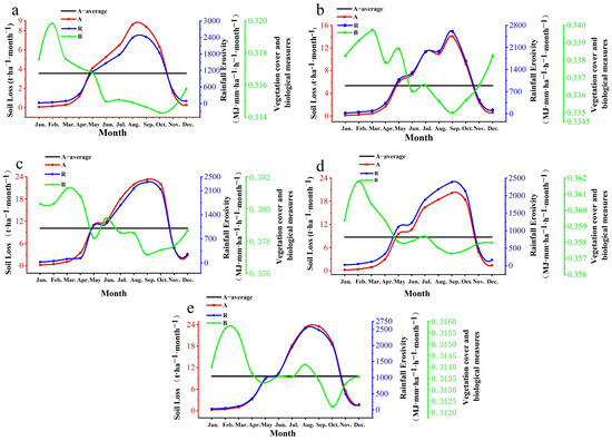 Variations in the soil erosion modulus by month and the dynamic factors throughout the twelve-month period. The soil erosion modulus was denoted by A; mean soil erosion modulus on a monthly basis was expressed as the A-average; rainfall erosivity factor is represented by R; and vegetation cover and biological measures factors are denoted by B. (a) 2003, (b) 2006, (c) 2011, (d) 2016, (e) 2021.