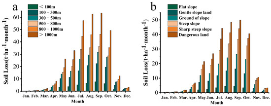 The variation in topography leads to differences in erosion severity. Erosion tends to be less intense on plains and plateaus compared to mountains, with low-relief mountains experiencing less erosion than high-relief mountains. Notably, during the summer months, the average erosion modulus for high-altitude mountains is approximately 1.7 times greater than that of low-altitude mountains. Furthermore, the erosion modulus for high-altitude mountains exceeds that of plains by more than eight times. Specifically, in June, July, and August, the ratios are 8.87, 11, and 9.4 times, respectively (Figure 11). The average erosion modulus increases with the slope’s steepness, following this order: dangerous slope erosion modulus > sharp slope erosion modulus > steep slope erosion modulus > ground slope erosion modulus > gentle of slope erosion modulus > flat slope erosion modulus.