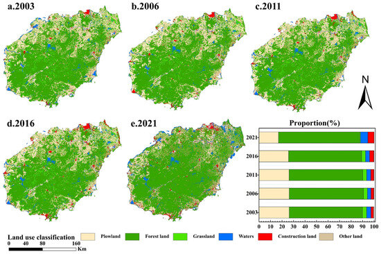 where the k-th half-month’s rainfall erosivity was expressed as , and the a year is made up of 24 half-months (k = 1–24, a half month was recorded as 15/16 days) in units of MJ·mm·hm−2·h−1·a−1; i = 1, 2, …, N; in this analysis, N represents a 30-year time series length. R-values were calculated for 2003 using daily rainfall data from 1971 to 2000, for 2006 using 1976 to 2005, for 2011 using 1981 to 2010, for 2016 using 1986 to 2015, and for 2021 using 1991 to 2020; j = 0, 1, …, m; m denotes the total days with erosive rainfall occurring in the pertinent half-month, where erosive rainfall is indicated by daily totals of 10 mm or greater. The daily erosive rainfall is denoted by Pi,j,k, mm. In the warm season, which occurs from May to September, α is 0.3937, while it is 0.3101 in the remaining seasons. Based on each weather station, the monthly rainfall is divided into two and a half months, and the monthly rainfall erosivity is obtained by calculating the daily rainfall erosivity. Therefore, the rainfall erosivity of each month is derived by adding the corresponding two and a half months. The calculated values are interpolated into the Hainan Island R-grid layer by the ordinary Kriging method, and the R-grid map with a resolution of 10 m can be obtained.