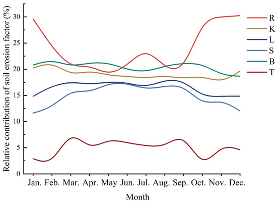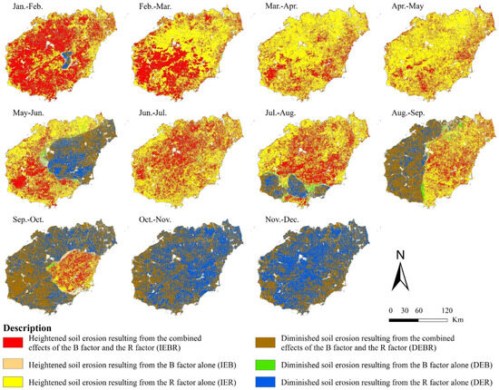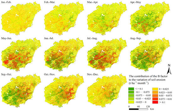 Numerous researchers have centered their discussions on the alterations in soil erosion and elements that lead to these changes [55,56], and it is not uncommon to find studies that reveal the positive correlation between rainfall erosivity factor and soil water erosion change and that the rainfall erosivity factor is regarded as the main controlling factor with the largest contribution [34,57]. Analyzing the spatial dispersion and temporal variation characteristics of rainfall erosivity is essential for soil erosion research, as it aids in assessing soil erosion potential in the research area and quantitatively predicting regional soil loss [58,59]. The R factor and B factor have long time series dynamic data, and the application of these dynamic factors in evaluating soil erosion is crucial for accurately identifying the high-risk periods. This study highlights that the difference concerning the monthly soil erosion modulus was driven by rainfall intensity during various periods. The period characterized by the highest R factor coincided with the most significant instances of soil erosion. May, as the first month of the rainy season in Hainan Island, exhibited an erosion modulus (8.11 t·hm−2·month−1) that was higher than the monthly soil erosion modulus mean value (7.73 t·hm−2·month−1) (Figure 10). In the early rainy season, many plants have not yet fully grown or recovered, especially in early summer, which leads to a reduction in the protective layer of the soil and increases the risk of soil quality being transferred, reflecting the lag in plant development. Therefore, May is identified as the first erosion risk month. September is determined to be the period of most severe soil erosion. Located at the northern boundary of the tropics, Hainan experiences its peak yearly rainfall erosivity from July to October. The tropical monsoon weather pattern results in frequent typhoons and heavy rains during the summer and autumn, leading to the most concentrated erosive rainfall.