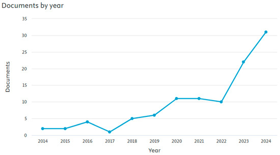 Bibliometric analyses in the Scopus database were performed to explore the current literature state contributing to cross-border research between BDAC and sustainability business performance. This search was performed based on the keywords “sustainability business performance” and “big data analytics capability” or “big data”, and it was limited to the subject areas of “Business, Management and Accounting”, “Decision Sciences”, and “Economics, Econometrics and Finance”. Conducted on 16 January 2025. As the phenomenon is new, no timeframe limitation was applied. For the analyses, only articles in English were filtered. This approach resulted in 105 articles starting from 2014, as reflected in Figure 4. The topicality was proved by the increasing number of publications issued within the last three years, growing from ten articles in 2022 to thirty-one articles in 2024, showing the rapidly growing scholarly research interest in the relationship between BDAC and sustainability business performance.